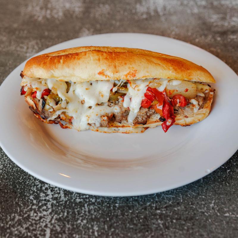 Steak, blend of roasted peppers and onions, provolone & garlic aioli, served on toasted hoagie roll.