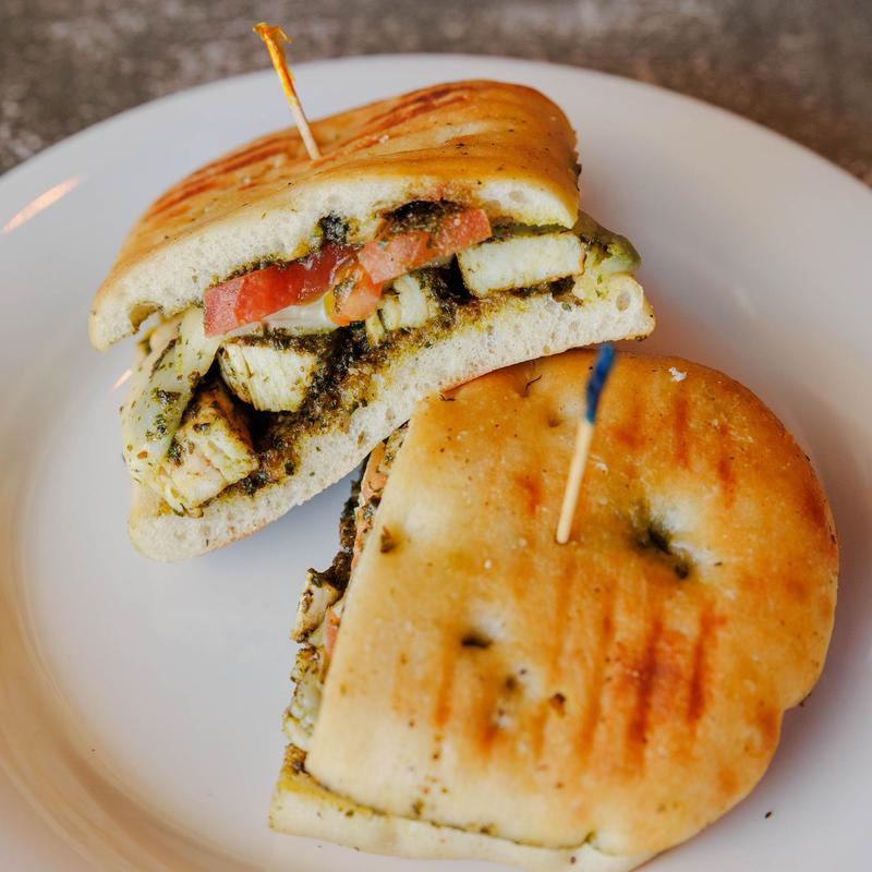 Chicken tossed in pesto sauce, provolone & tomato on panini bread.