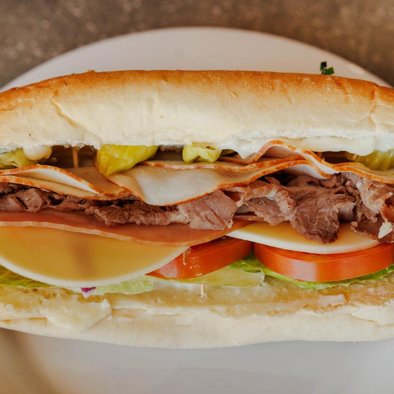 Roast beef, turkey, ham, provolone, pepperoncini, mayo, spicy mustard, lettuce, tomato & onion on hoagie.