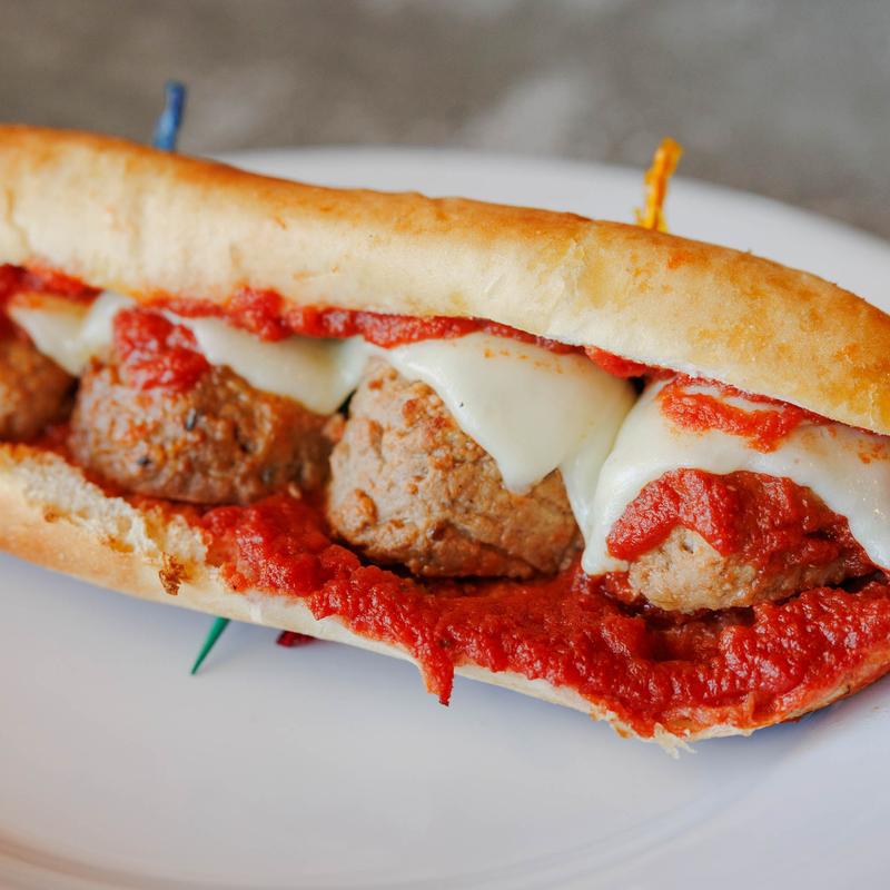 Meatball in marinara with mozzarella cheese served on a sub roll.