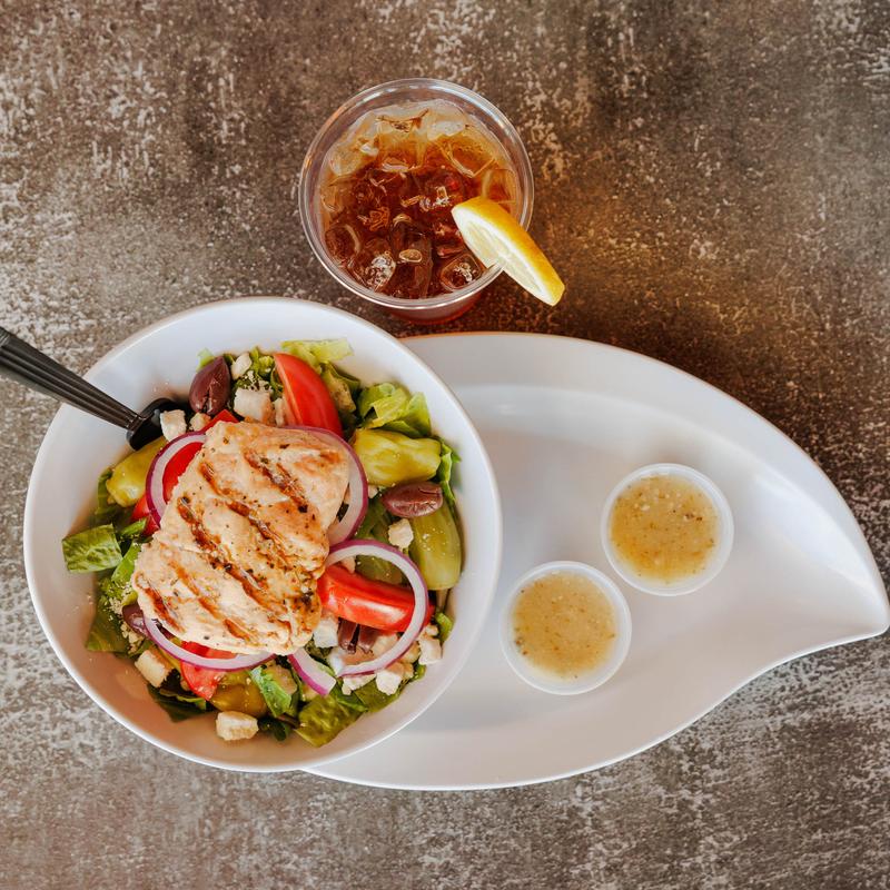 Romaine, grilled salmon, feta, pepperoncini, kalamata olives, tomatoes, red onion & Greek dressing.