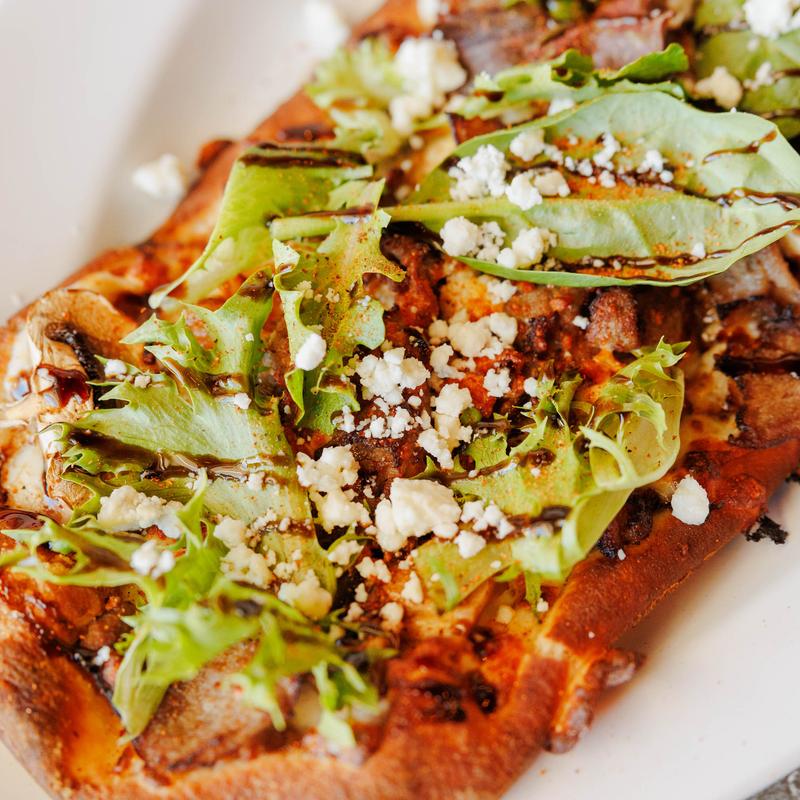 Blackened steak, caramelized onions, mushrooms, mozzarella & blue cheese, finished with fresh arugula & sweet balsamic glaze.