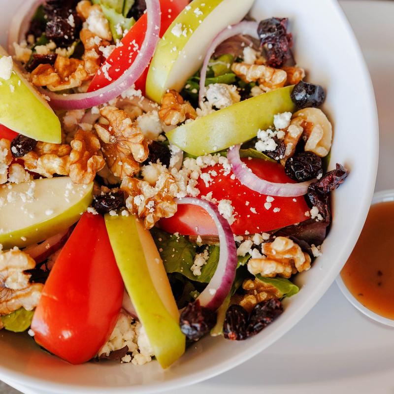 Romaine, mixed greens, walnuts, dried cranberries, bleu cheese crumbles, apples, tomatoes, red onion & balsamic vinaigrette.