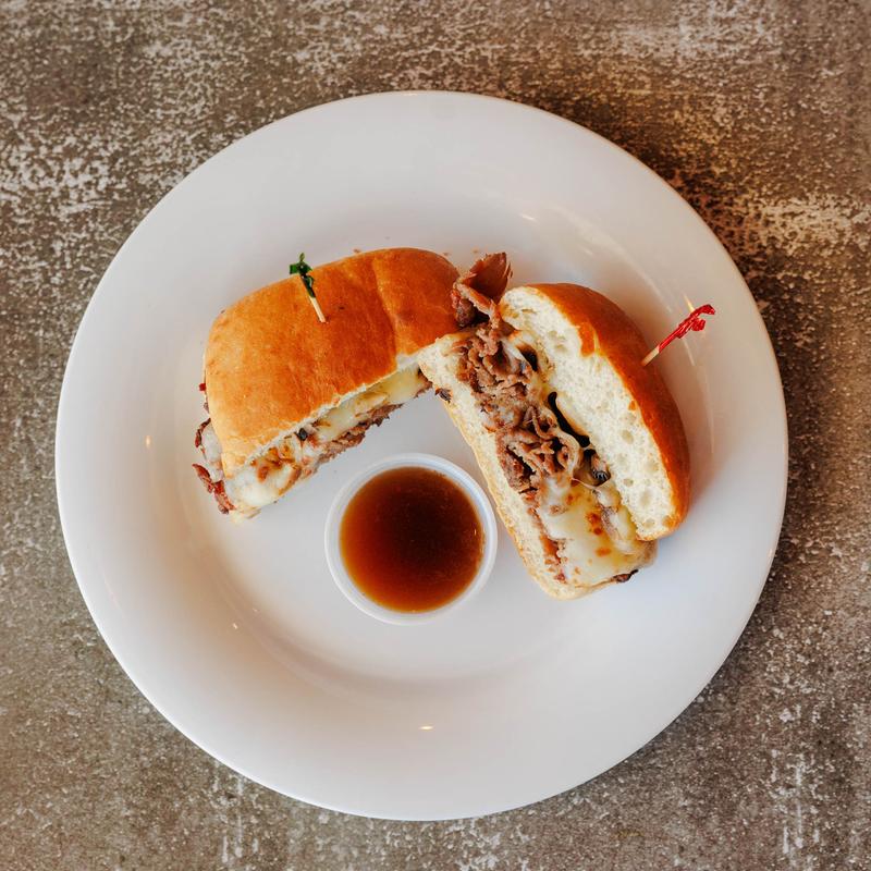 Roast beef, provolone & mushrooms on ciabatta bread served with au jus on the side.